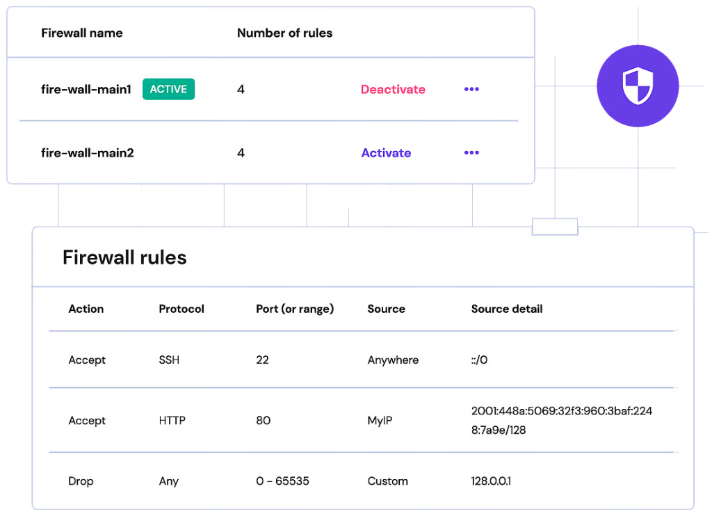 Ensure security for your virtual machine with our Wanguard DDoS filtering and easily configurable firewall, preventing harmful traffic.